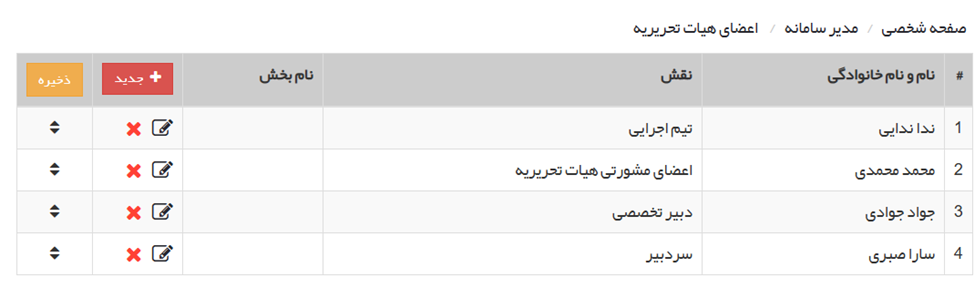 به بخش "مدیر سامانه" و "اعضای هیات تحریریه" بروید. روی "جدید" کلیک کنید. نقش فرد (سردبیر، عضو هیئت تحریریه، مدیر داخلی و...)، نام، رشته تخصصی، وابستگی سازمانی (فارسی و انگلیسی)، ORCID، h-index، ایمیل، عکس و سایر اطلاعات را وارد کنید. گزینه "نمایش در صفحه اصلی" را فعال کنید و ذخیره نمایید. میتوانید ترتیب نمایش افراد را نیز تنظیم کنید.
