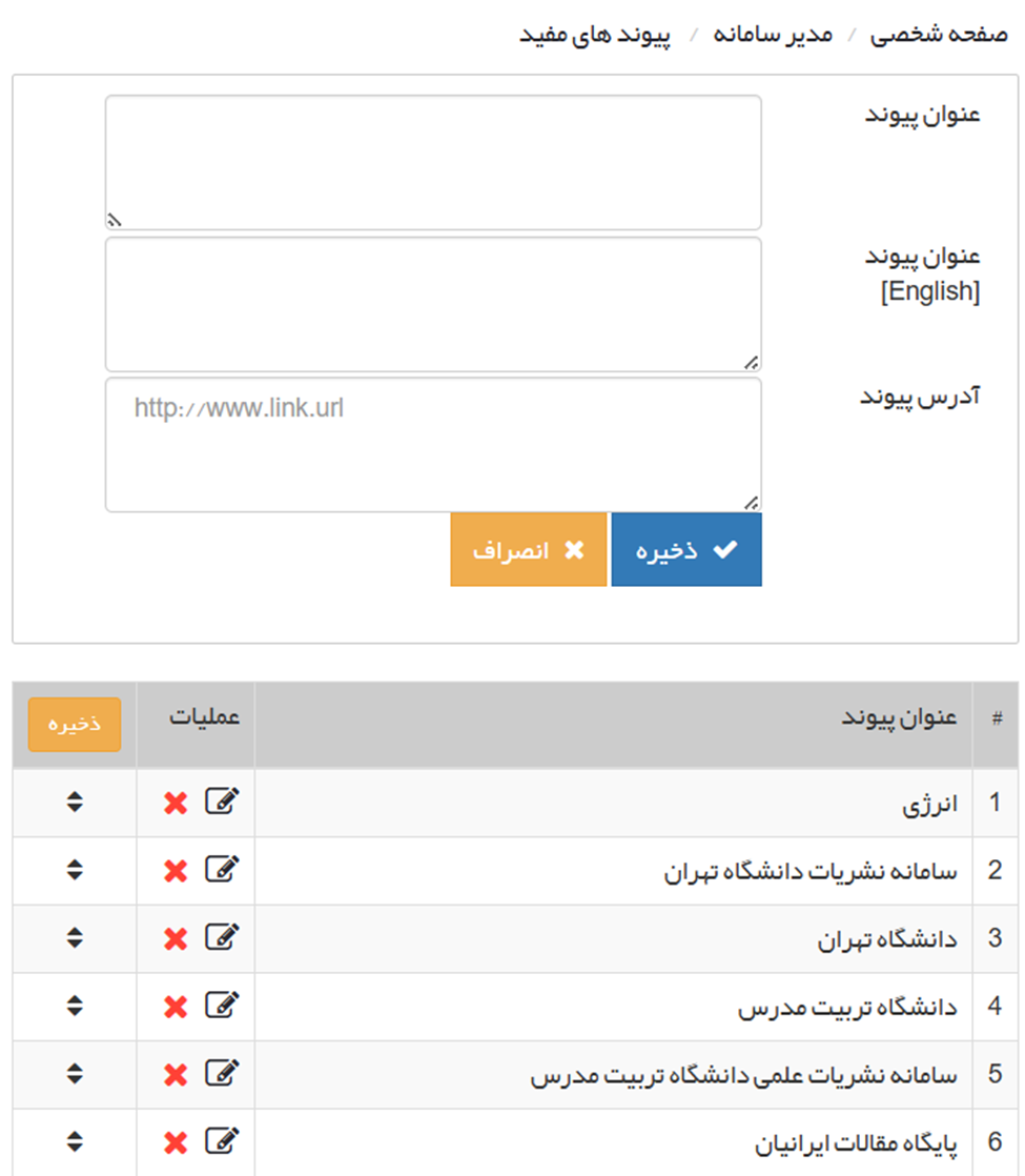 ○ پیوندهای مفید: به بخش "مدیر سامانه" و "پیوند های مفید" بروید. عنوان و آدرس پیوند را وارد و ذخیره کنید.