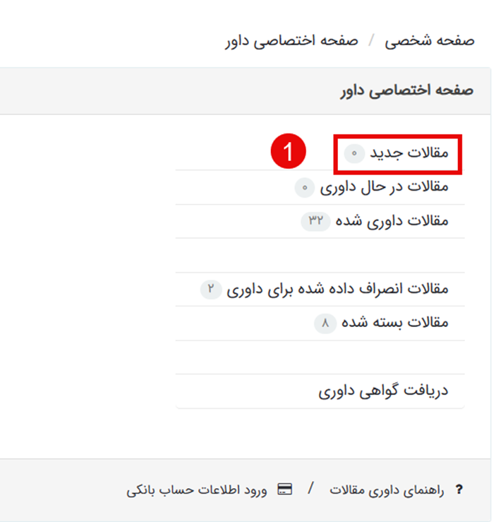 از منوی "داور" در پنل کاربری خود، گزینه "مقالات جدید" را انتخاب کنید. با کلیک روی کد مقاله، چکیده را مشاهده کرده و گزینه قبول یا رد داوری را انتخاب و ذخیره کنید.