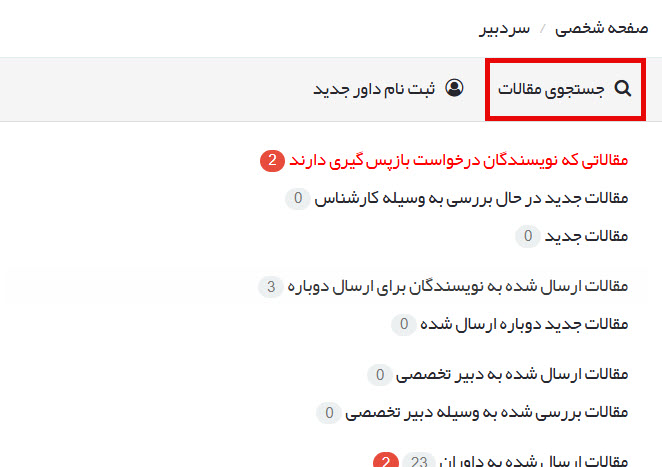 از بخش "جستجوی مقالات" استفاده کنید. میتوانید بر اساس کد مقاله، عنوان، نام نویسنده، وضعیت مقاله، موضوع، تاریخ ارسال/بازنگری/پذیرش/آخرین تغییرات یا وضعیت داوری (تعداد داوری، نظر نهایی) جستجو و گزارشگیری کنید. امکان دریافت خروجی اکسل با جزئیات کامل (اطلاعات مقاله، نویسندگان، داوران، دبیر تخصصی، هیئت تحریریه، پیگیریها، زمانبندیها) وجود دارد.