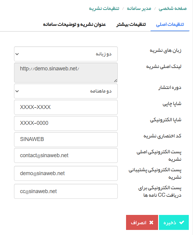 چگونه تنظیمات اصلی نشریه (زبان، لینک اصلی، دوره انتشار، شاپا، کد اختصاری، ایمیلها) را انجام دهم؟