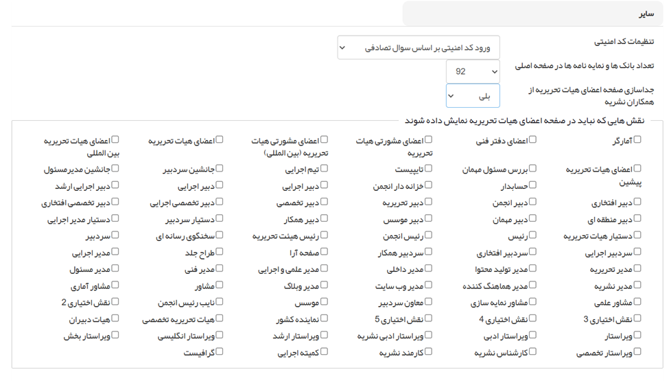 ○ نشست (Session): تنظیمات مربوط به لاگین کاربران (حداکثر نشست فعال همزمان، مدت زمان لاگین ماندن، حداکثر تلاش ناموفق برای ورود و مدت قفل شدن اکانت) را مدیریت کنید.سایر: تنظیمات کد امنیتی (کپچا)، تعداد بانکها و نمایهنامهها در صفحه اصلی و جداسازی صفحه اعضای هیئت تحریریه از همکاران را تنظیم کنید.