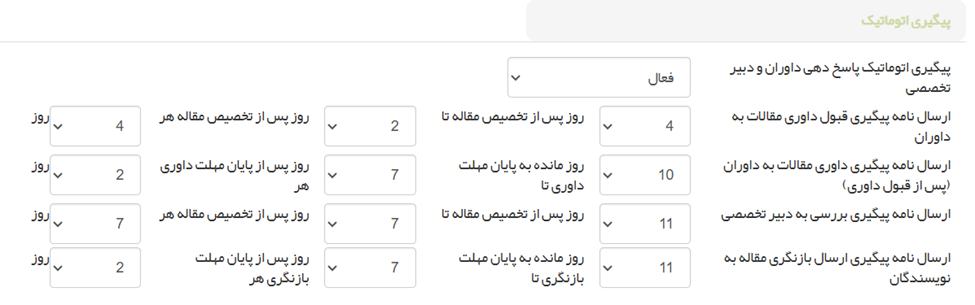 ○ پیگیری اتوماتیک: ایمیلهای پیگیری خودکار برای داوران (قبول/انجام داوری)، دبیر تخصصی و نویسندگان (ارسال بازنگری) را فعال/غیرفعال و زمانبندی ارسال آنها را تنظیم کنید.