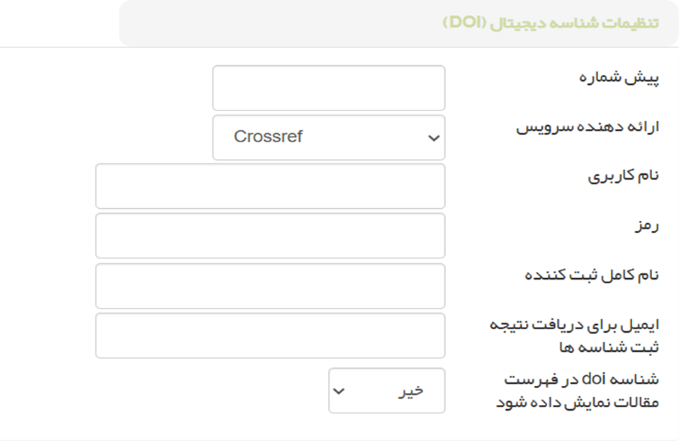○ شناسه دیجیتال (DOI): پیششماره DOI، ارائهدهنده سرویس (مثلاً Medra)، اطلاعات اکانت و تنظیمات نمایش DOI را وارد کنید.