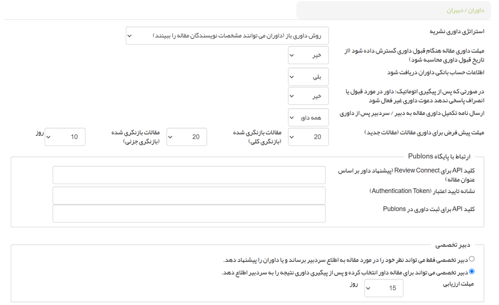 ○ داوران/دبیران: استراتژی داوری (باز یا بسته)، محاسبه مهلت داوری (از زمان ارسال یا قبول )، نمایش خودکار فایل به داور ، دریافت اطلاعات حساب بانکی داوران ، غیرفعال شدن خودکار دعوت داوری در صورت عدم پاسخ، مهلتهای پیشفرض داوری (جدید، بازنگری کلی/جزئی) و تنظیمات مربوط به Publons را مدیریت کنید. تنظیمات دسترسی اعضای هیئت تحریریه (مشاهده مشخصات نویسنده، نظرات داوران و ...) نیز اینجا انجام میشود.