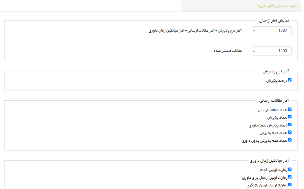 ○ آمار نشریه: تنظیمات نمایش آمار نشریه در صفحه /journal/metrics (سال شروع، نمایش نرخ پذیرش، آمار مقالات ارسالی، میانگین زمان داوری، تعداد مقالات منتشر شده و ...) را مدیریت کنید.