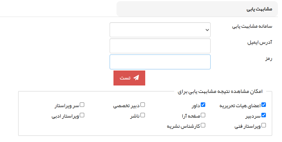○ مشابهتیابی: سامانه مشابهتیاب مورد استفاده (مانند iThenticate)، اطلاعات اکانت و نقشهایی که میتوانند نتیجه را ببینند، تنظیم کنید.