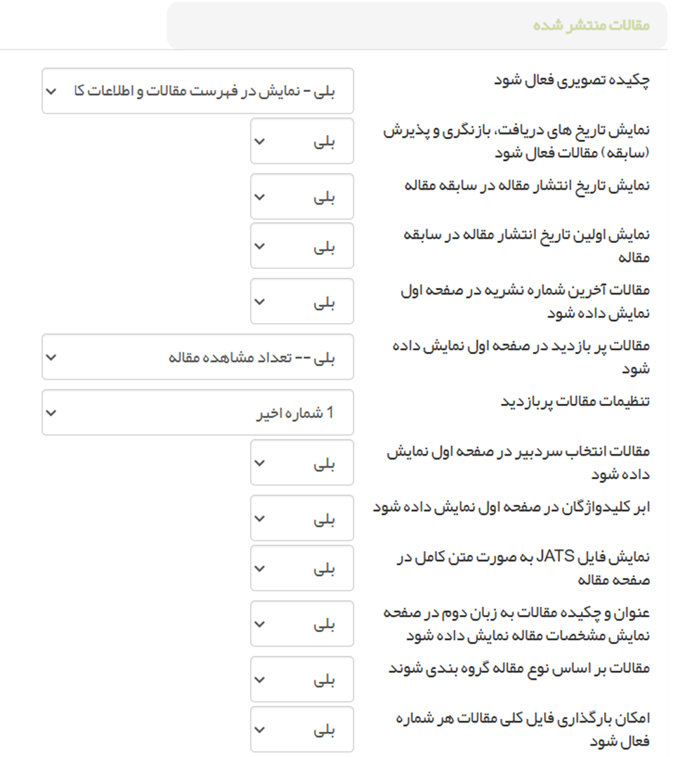 ○ مقالات منتشر شده: فعال/غیرفعال کردن چکیده تصویری، نمایش تاریخهای دریافت/بازنگری/پذیرش، نمایش مقالات آخرین شماره یا پربازدید یا انتخاب سردبیر در صفحه اول، نمایش ابر کلیدواژگان، نمایش فایل JATS، نمایش عنوان/چکیده زبان دوم، گروهبندی بر اساس نوع مقاله، امکان آپلود فایل کلی شماره و لینک کردن عنوان مقاله به PDF را مدیریت کنید.