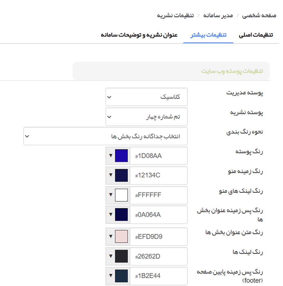 ○ پوسته وب: ظاهر سایت (تم، رنگبندی، فونت، اندازه فونت) را تنظیم کنید.
