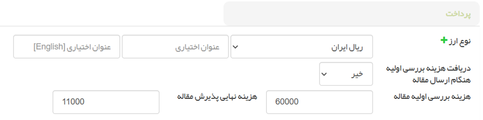 ○ پرداخت: نوع ارز، فعال/غیرفعال کردن و تعیین مبلغ هزینه بررسی اولیه و هزینه نهایی پذیرش را تنظیم کنید.