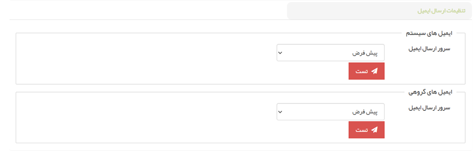 ○ ارسال ایمیل: تنظیمات سرور ارسال ایمیل (SMTP) برای ایمیلهای سیستمی و گروهی را وارد کنید.