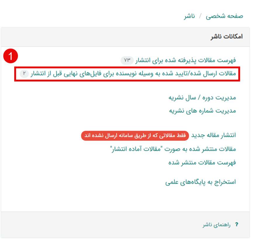 از منوی "ناشر"، بخش "مقالات ارسال شده / تایید شده به وسیله نویسنده برای فایل های نهایی قبل از انتشار" را انتخاب کنید.