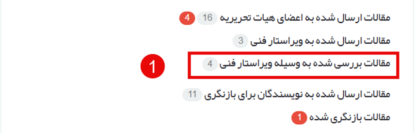 از منوی "سردبیر"، گزینه "مقالات بررسی شده به وسیله ویراستار فنی" را انتخاب کنید.