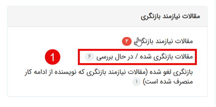 از منوی "نویسنده"، گزینه "مقالات بازنگری شده / درحال بررسی" را انتخاب کنید.