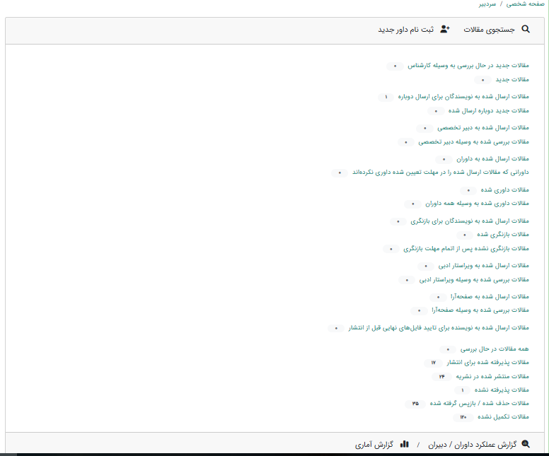 - گزارش گیری از وضعیت داوران(تعداد مقالات داوری شده یا در حال داوری، پرداخت های صورت گرفته به داور و ...)