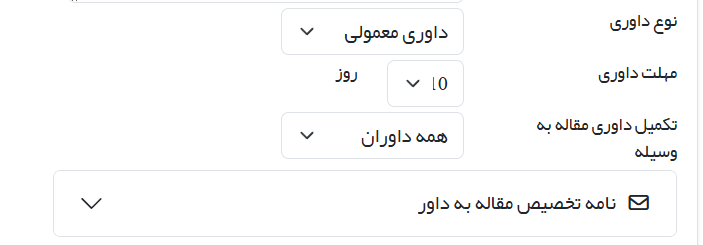 در منوی کشویی بعدی باید نوع داوری، برای مثال اولیه یا تطبیقی را انتخاب کنید. همچنین در صورت لزوم میتوان مهلت داوری را به صورت دستی تغییر داد. مهلت داوری پیشفرض را مدیر سامانه از بخش تنظیمات نشریه، تنظیمات بیشتر، داوران/ دبیران تعیین میکند. میتوانید تعیین کنید که مقاله پس از دریافت پاسخ چند داور به بخش مقالات تکمیل داوری شده منتقل شود.