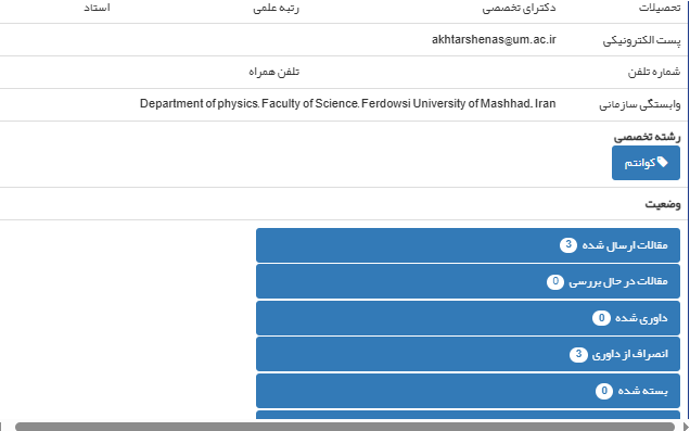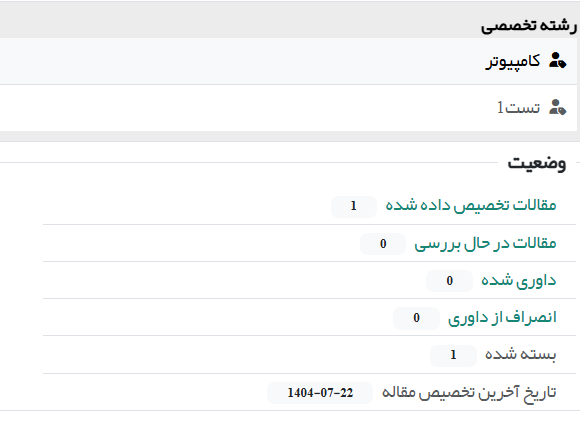 با کلیک کردن بر روی علامت ذرهبین اطلاعات کامل داور و گزارشی از عملکرد ایشان شامل تعداد مقالات داوری شده یا انصراف داده شده نمایش داده میشود.
