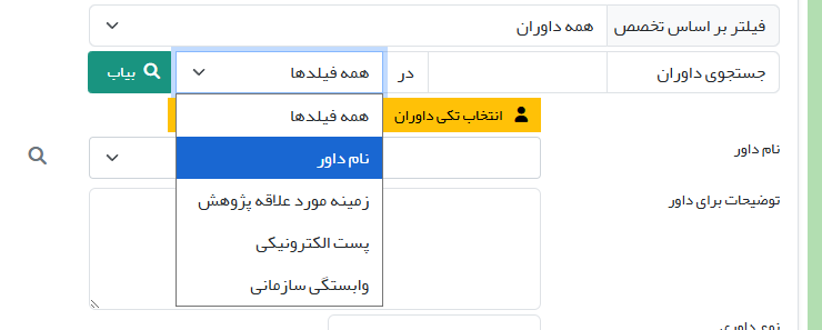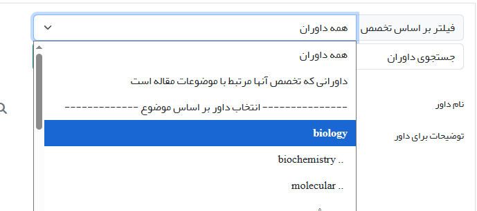 در منوی کشویی نمایش داوران میتوانید فیلترهایی را برای جستجوی داوران تعیین کنید، برای مثال بخواهید که جستجوی داوران در میان داورانی با تخصص خاص یا تخصص مرتبط با موضوع مقاله انجام شود.