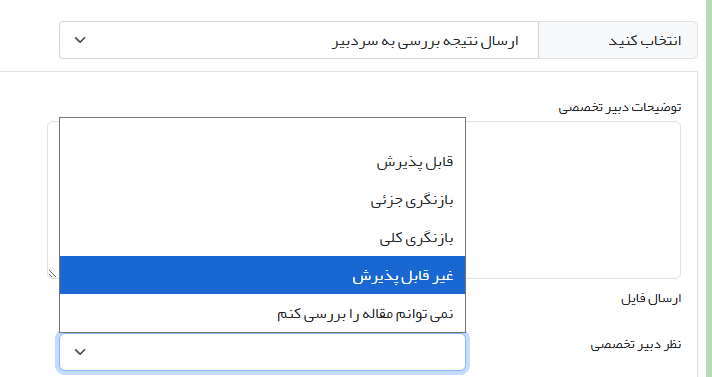 ارسال نتیجه بررسی به سردبیر: با کلیک بر روی منوی کشویی نظر دبیر تخصصی میتوانید با توجه به کیفیت مقاله آن را قابل پذیرش یا غیرقابلپذیرش اعلام کنید، درخواست بازنگری کلی یا جزئی کنید یا به سردبیر اعلام کنید که نمیتوانید مقاله را بررسی کنید. توضیحات بیشتر را میتوانید در کادر درج کنید و فایل تکمیلی را نیز پیوست کنید.