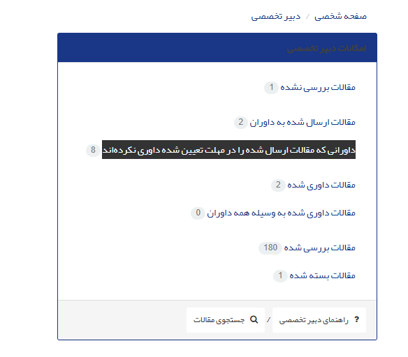پاسخ: به بخش "داورانی که مقالات ارسالشده را در مهلت تعیینشده داوری نکردهاند" مراجعه کنید و روی پیگیری از داور کلیک کنید یا اطلاعات داور را استخراج کنید و با او تماس بگیرید.