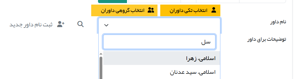 چنانچه نام داور را بدانید، کافی است در کادر نام داور، چند حرف اول نام خانوادگی ایشان را تایپ کنید تا نام داور آورده شود. امکان ثبتنام داور جدید نیز برای دبیر تخصصی وجود دارد.