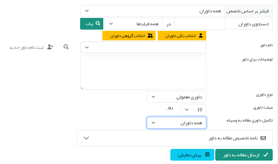 اگر بخواهید چند داور را همزمان برای مقاله تعیین کنید، باید روی دکمه انتخاب گروهی داوران کلیک کنید.