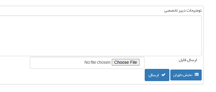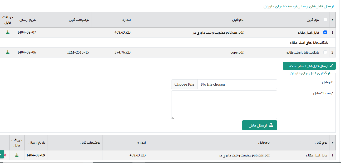 اگر لازم است فایلی را خارج از فایلهای ارسالی نویسنده برای داور ارسال کنید، فایل را انتخاب کنید و سپس روی ارسال فایل کلیک کنید.