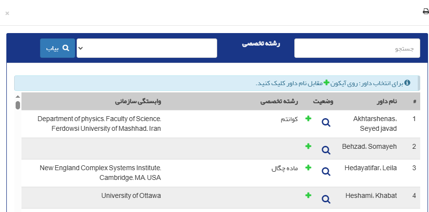 پس از یافتن داور موردنظر کافی است روی علامت مثبت سبزرنگ کلیک کنید تا نام داور به کادر توضیحات اضافه شود.