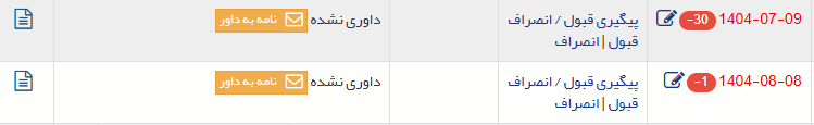 * لغو داوری (با علامت لغو ◯̸): تاریخ ارسال مقاله به داور و تاریخ لغو داوری در سابقه مقاله باقی میماند و فقط فرایند داوری متوقف میشود.