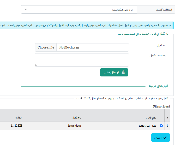یک. بررسی مشابهت: چنانچه نشریه به سامانه مشابهتیاب متصل باشد، کافی است فایل مقاله بارگذاری و دکمه ارسال زده شود تا مشابهتیابی انجام شود.