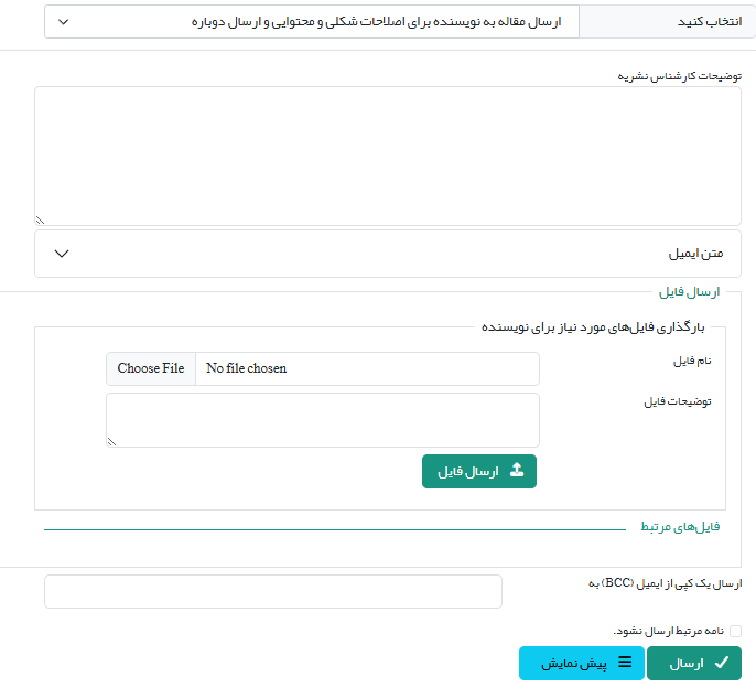 چهار. ارسال مقاله به نویسنده برای اصلاحات شکلی و محتوایی و ارسال دوباره: کارشناس میتواند توضیحات لازم را برای نویسنده بنویسد تا به متن ایمیل پیشفرض اضافه شود. همچنین امکان ارسال فایلهای لازم برای نویسنده نیز وجود دارد.