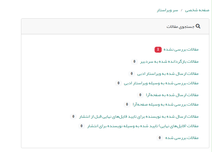 - مقالات بررسی نشده: با کلیک بر روی این بخش صفحهای حاوی مقالات جدید ارسالشده از سوی سردبیر برای سرویراستار باز میشود.