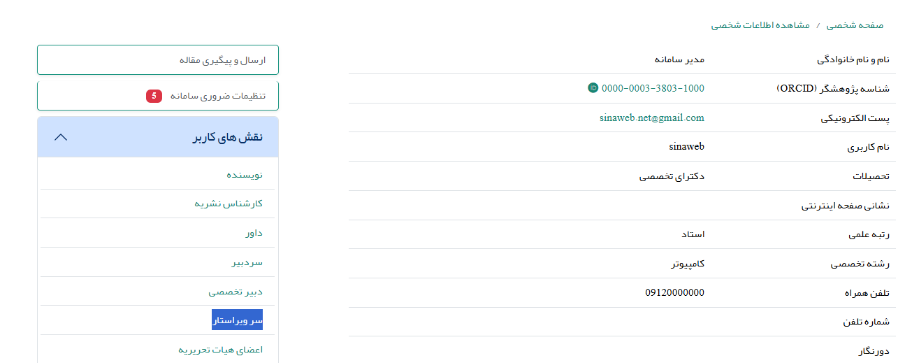 چنانچه مدیر سامانه نقش سرویراستار را به یکی از کاربران تخصیص دهد، گزینه های ارسال مقاله به ویراستار ادبی، صفحه آرا و ارسال به نویسنده برای تأیید فایل های نهایی قبل از انتشار از نقش سردبیر به نقش سر ویراستار منتقل می شود. صفحه اختصاصی سرویراستار به شکل زیر است: