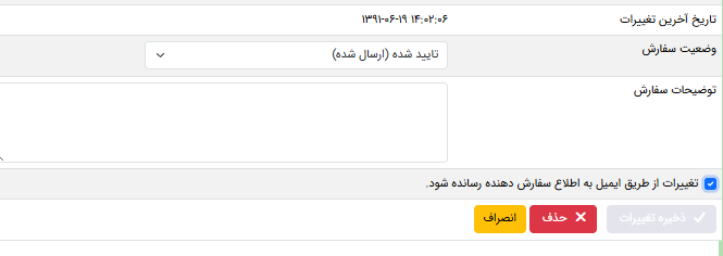 پاسخ: در همان فرم ویرایش سفارش، یک گزینه با عنوان «تغییرات از طریق ایمیل به اطلاع سفارشدهنده رسانده شود» وجود دارد. با فعال کردن (تیک زدن) این گزینه، یک ایمیل اطلاعرسانی برای کاربر ارسال میشود.