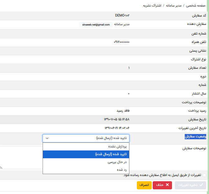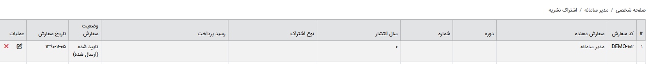 چنانچه فرم اشتراک را فعال کنید و فردی این فرم را تکمیل کند، اگر در پنل مدیریت سامانه روی گزینه اشتراک نشریه کلیک کنید، میتوانید سفارشهای ثبتشده را ملاحظه کنید.