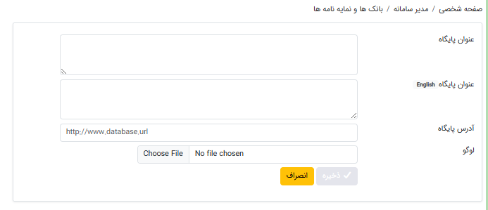 - روی دکمه "جدید" کلیک کنید تا فرم زیر باز شود. عنوان پایگاه را به فارسی و انگلیسی وارد کنید.