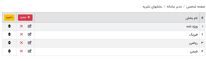 اگر از قبل بخشی تعریف شده باشد، میتوانید آن را با کلیک بر روی علامت قلم یا ضربدر ویرایش یا حذف کنید. همچنین ترتیب بخشها را نیز میتوانید با نگه داشتن ماوس روی فلشها تغییر دهید.
