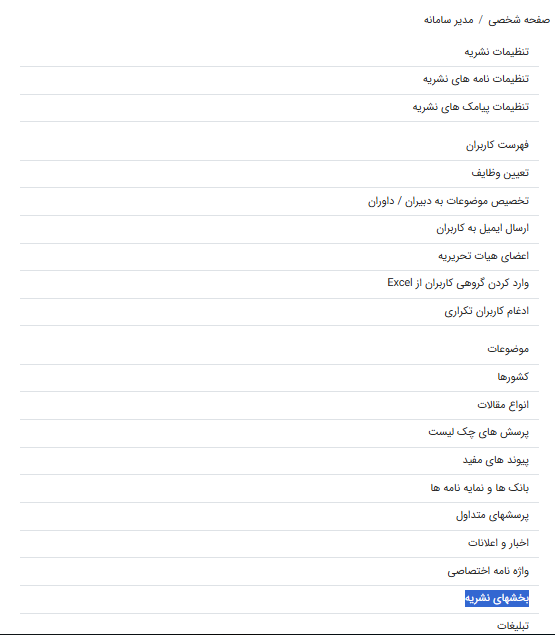 ابتدا نقش مدیر سامانه را انتخاب کنید. سپس روی گزینه بخشهای نشریه در پنل مدیر سامانه کلیک کنید.