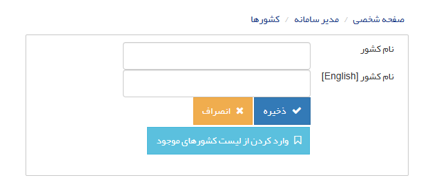 پاسخ: اگر هنوز هیچ کشوری اضافه نکردهاید، روی گزینه وارد کردن از فهرست کشورهای موجود در بخش کشورهای مدیر سامانه کلیک کنید تا نام تمام کشورها به سرعت اضافه شود.