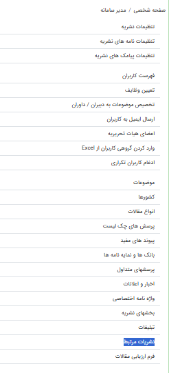 ابتدا نقش مدیر سامانه را از صفحه شخصی انتخاب کنید. سپس در پنل مدیریت سامانه روی گزینه نشریات مرتبط کلیک کنید.
