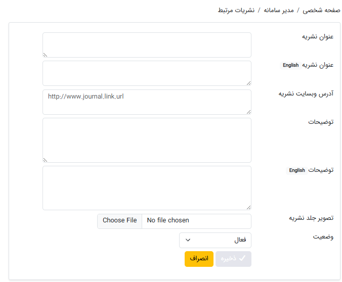 - عنوان نشریه و توضیحات مرتبط را به فارسی و انگلیسی وارد کنید.