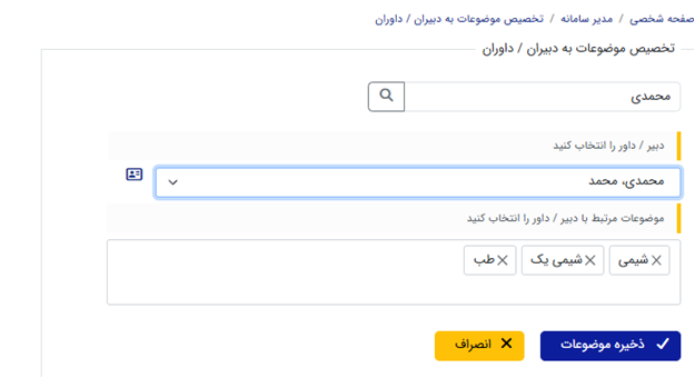با کلیک روی ذخیره موضوعات، تخصصهای داور یا دبیر را ذخیره کنید.