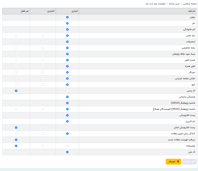 همانطور که در فرم زیر میبینید، برای هر فیلد از اطلاعات سه گزینه اجباری، اختیاری و غیرفعال وجود دارد.