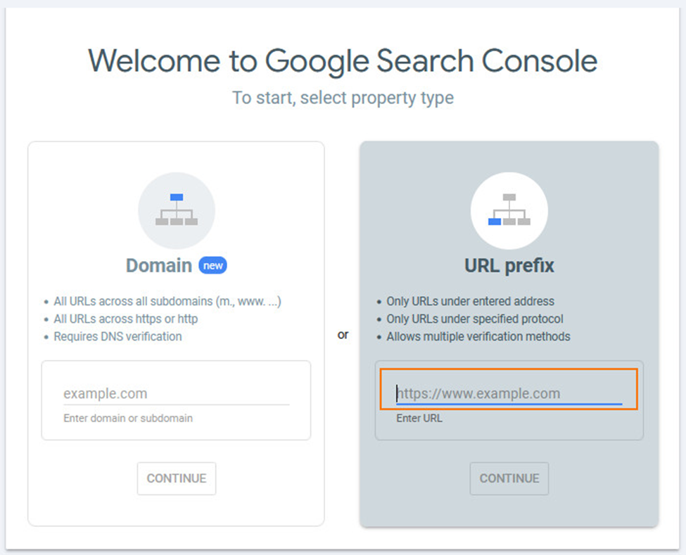 در قسمت "URL Prefix"، آدرس سایت خود را وارد کنید باید آدرس کامل سایت (مثلاً https://example.com) را وارد کنید تا امکان نمایش مرحله بعد برای شما فعال شود. پس از ورود صحیح آدرس وب سایت نشریه روی گزینه continue کلیک کنید.