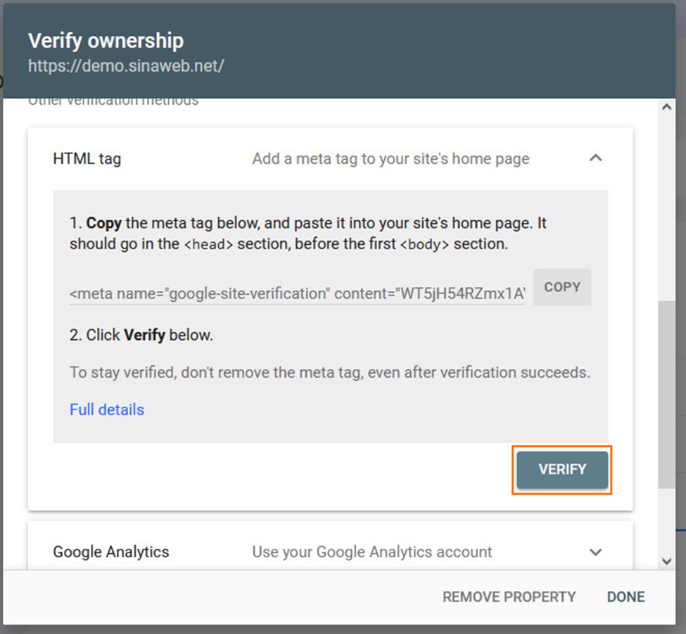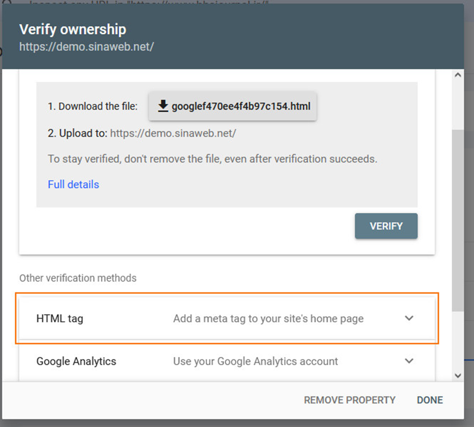 گوگل چند روش را برای تایید مالکیت پیشنهاد می دهد. از بین گزینه های موجود گزینه "HTML tag" را انتخاب کنید.