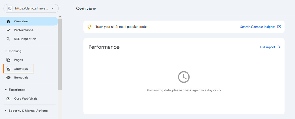 پس از تأیید مالکیت، به بخش "Sitemaps" در منوی سمت چپ بروید.