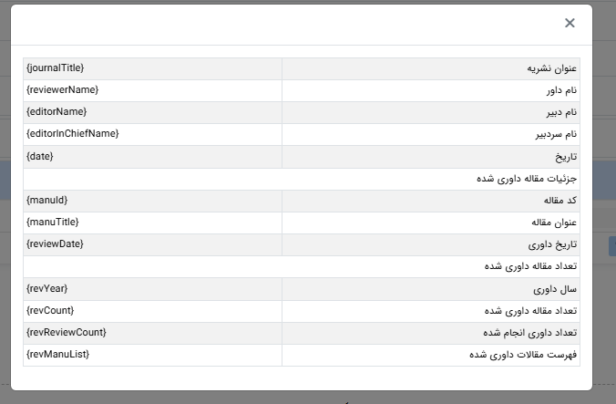 متن پیشفرض برای گواهیها وجود دارد که میتوانید آن را ویرایش کنید تا نویسندگان و داوران با یک کلیک گواهی مورد نظر را دریافت کنند. همانطور که در تصویر مشاهده میکنید، با کلیک روی علامت سوال کدهایی به شما نشان داده میشود.