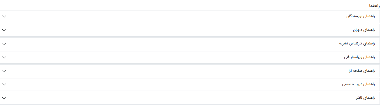 توصیه میشود راهنماهای مربوط به هر نقش را از سیناوب دریافت و در بخش مرتبط بارگذاری کنید. البته راهنمای نویسندگان به دو بخش اصلی تقسیم میشود: راهنمای ثبتنام و ارسال مقاله و دیگری راهنمای تهیه و تدوین مقاله مطابق استانداردهای نشریه. بخش دوم باید توسط سردبیر و هیات تحریریه نشریه تنظیم شود. پیشنهاد میشود قالب یا تمپلیت نشریه نیز در این بخش بارگذاری شود. همچنین در بخش راهنمای نویسندگان مواردی مانند فرم تعهدنامه و تعارض منافع نیز بارگذاری میشود.