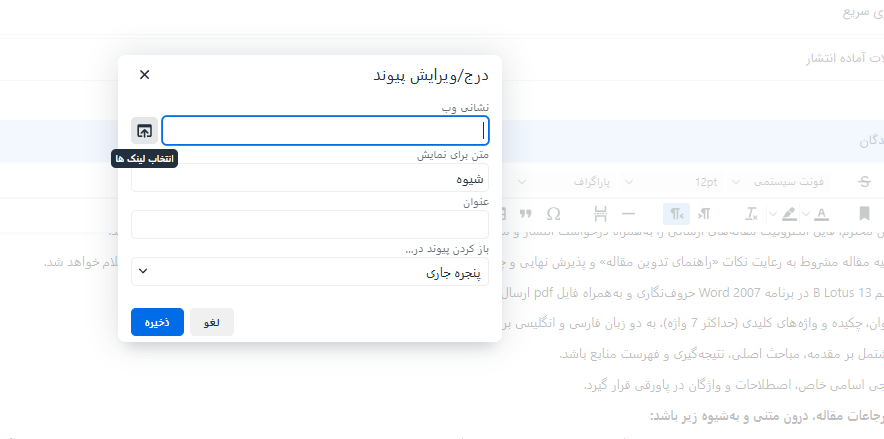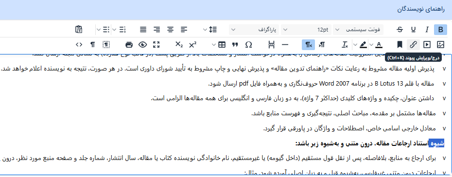 1ـ بخشی از متن را که میخواهید، فایل با کلیک بر روی آن دانلود شود، انتخاب کنید. سپس روی علامت زنجیر کلیک کنید.