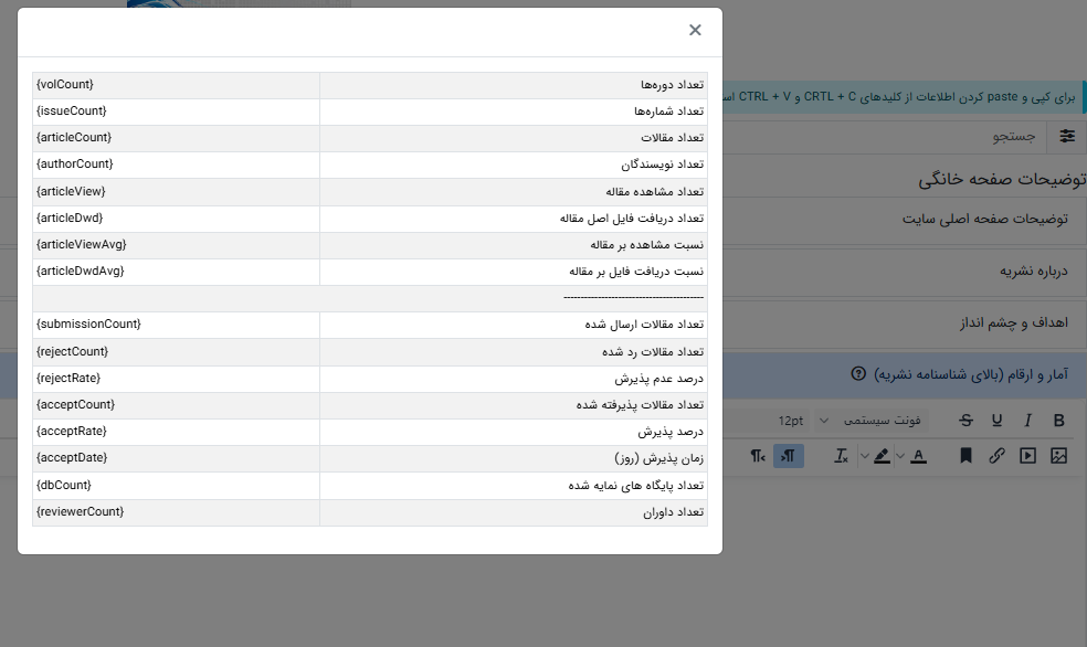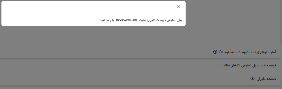 6ـ صفحه داوران (برای نمایش فهرست داوران عبارت {reviewersList} را وارد کنید): در این بخش میتوانید فهرست داورانی را که تا کنون برای نشریه شما داوری انجام دادهاند با وارد کردن یک کد درج نمایید.